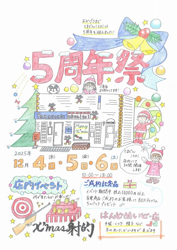 2025年12月4日(木)~6日(土)の3日間、とまでんitoi店内で5周年祭冬のパナソニックフェアを開催いたします!早いものでとまでんitoiに店名を変更してから5年が経ちます。