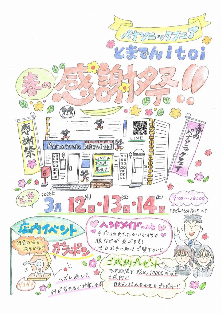 2026年3月12日(木)~3月14日(土)の3日間、とまでんitoi店内で春のパナソニックフェアを開催いたします!キャンペーン中の洗濯機や有機ELテレビを実際に見ていただける機会です!